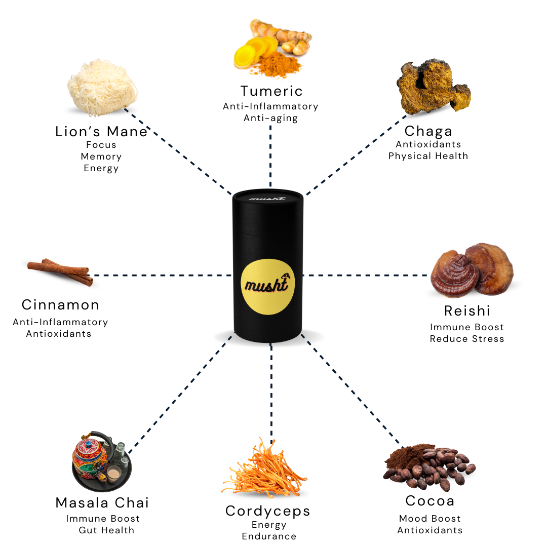 Cocoa, Lion's Mane, Chaga, Reishi, Cordyceps, Cinnamon, Masala Chai, Tumeric.