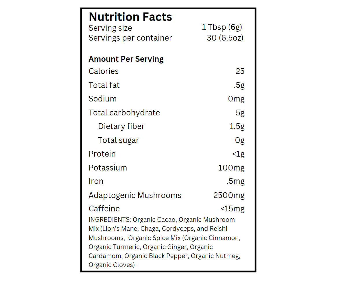 With lions mane, cordyceps, reishi, and chaga, you get a delicious earthy flavor. The warm, aromatic hint of cinnamon, masala chai, and turmeric adds complexity and zing. The dominant cocoa provides a luxurious, chocolaty smoothness to the blend. Every sip is a delightful journey of flavors.